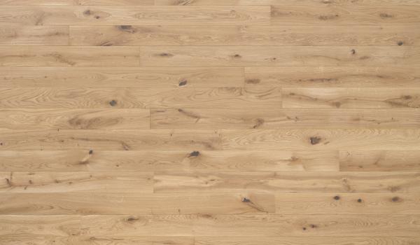 Extensive areas with lighter tones of colour are seen along the grain pattern and in the sapwood. Several large knots and natural fine splits occur. Knots and other irregularities are to the greatest extent possible factory filled with a one colour filler to ensure a uniform and beautiful surface.